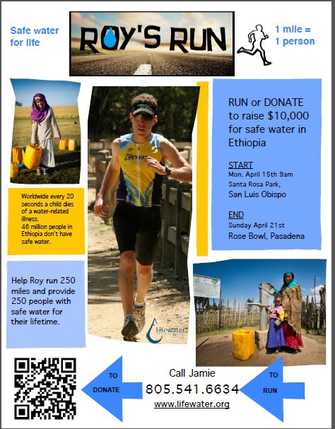 During my solo run, which will start from Santa Rosa Park in San Louis Obispo, California and finish at the Rose Bowl in Pasadena, I plan on being joined by runner friends and cyclists. I will be pushing a specially made racing stroller that will carry a large bottle of dirty water. This will symbolize what many people consider a normal water supply.